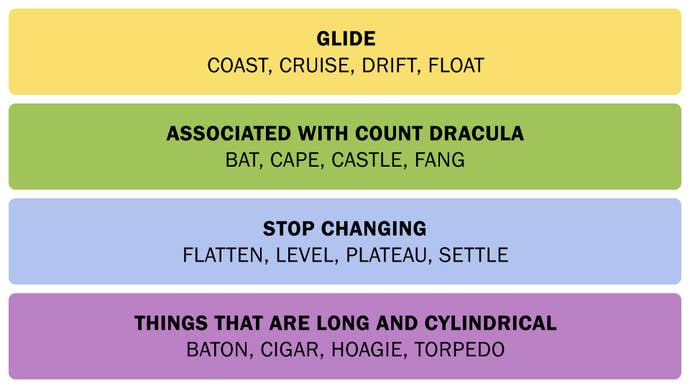 当我到达“ Dracula”时,今天的连接拼图对我来说相对容易。如果您看到“城堡”和“斗篷”,很难不去那里,不是吗?接下来,我开始注意到与“高度”有关的单词,例如“高原”,“级别”和“浮动”。我又看了一个很好的外观,很明显有一些关于前进的词,因此即使没有“滑行”方面,黄色类别也被揭示了。
