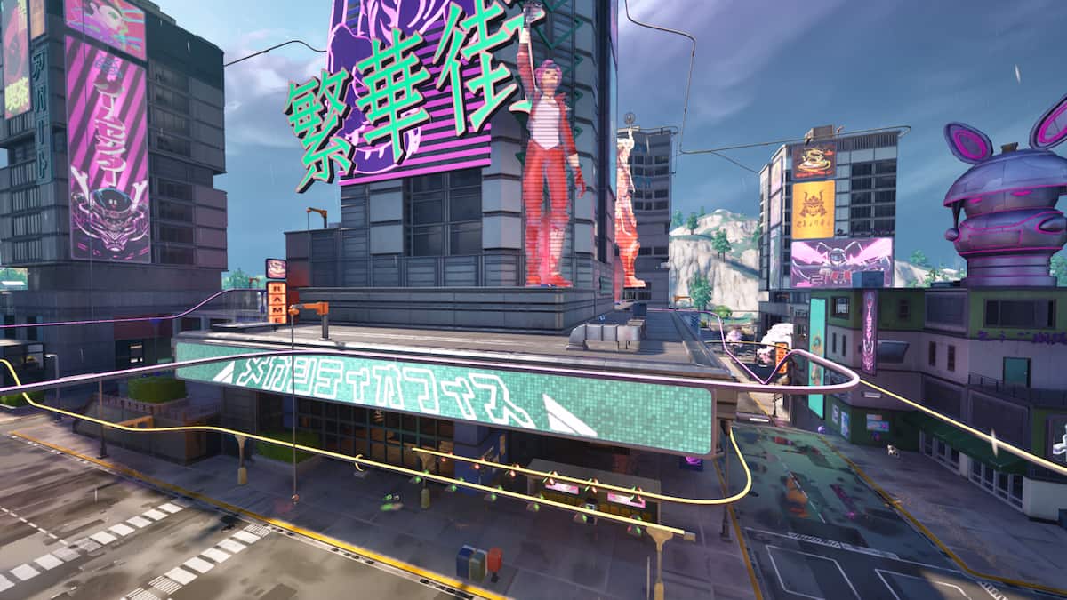 从 MEGA City 上方的巴士跳下后,飞向城市中心并找到该建筑物红色字符全息图在外面。金库位于这座建筑内,如上图所示。