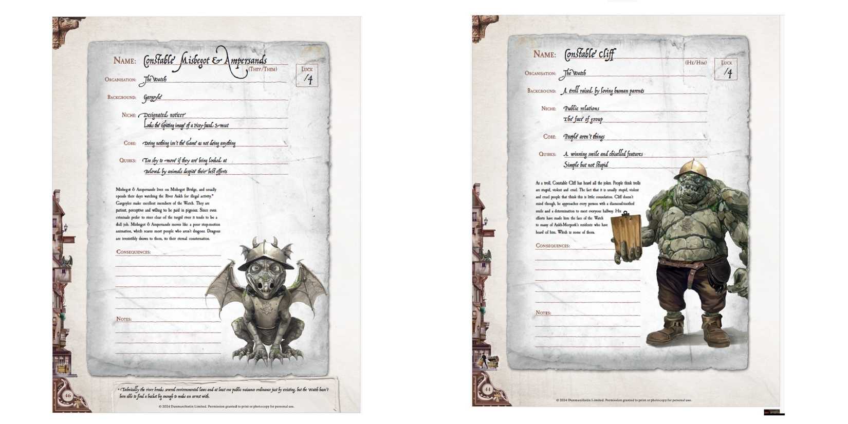 在快速入门规则中,对我来说突出的第二件事是角色的统计数据,或者更准确地说,是缺乏这些数据。每个角色都没有用数字来代表 Carrot 的灵巧或 Vimes 的固执,而是拥有一系列属性或特征。作为玩家,你的工作就是根据你的意愿塑造每一个特征,像粘土一样雕刻它,以说服你的 GM 你可以使用比你绝对值得的 D4 更好的模具。