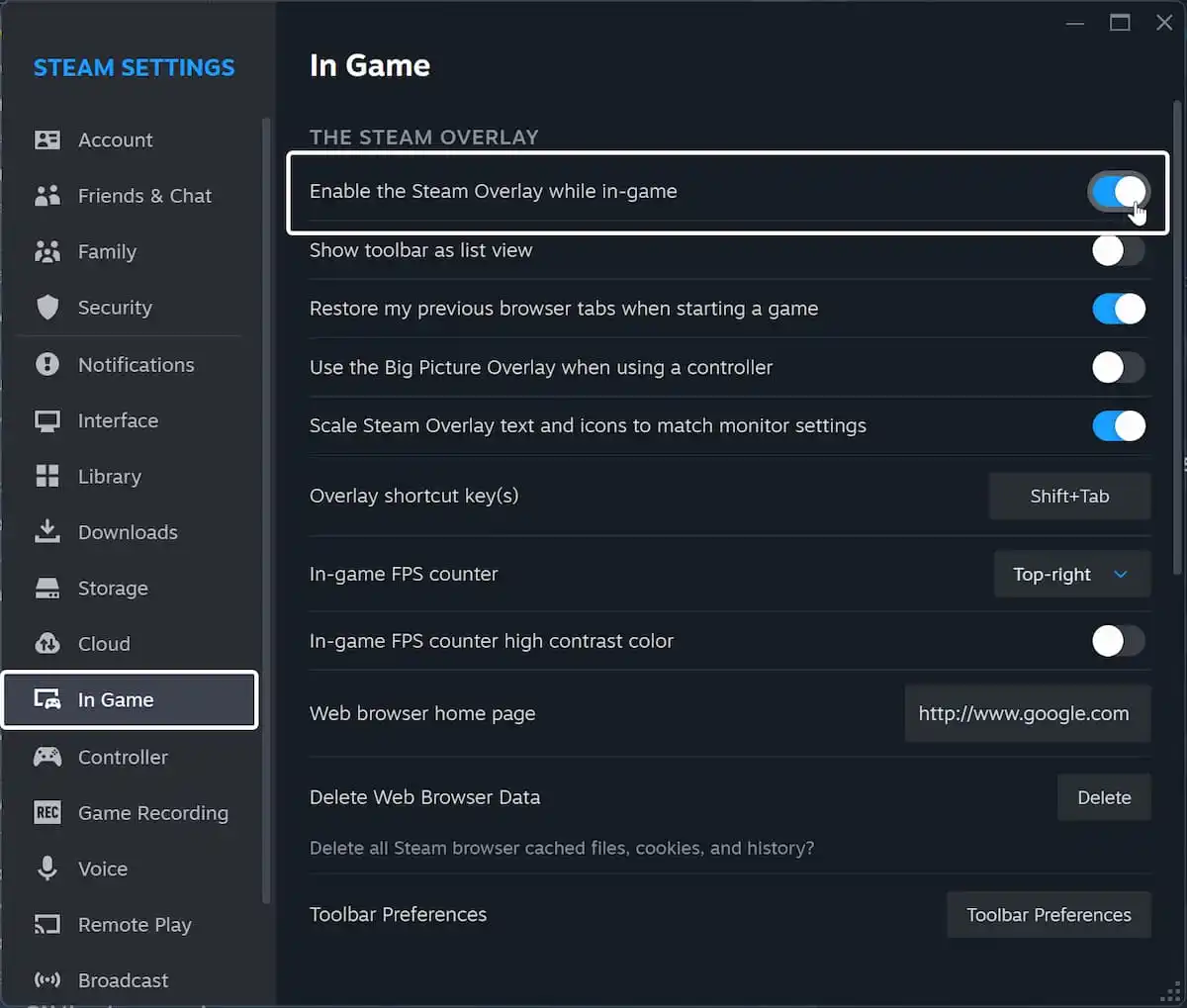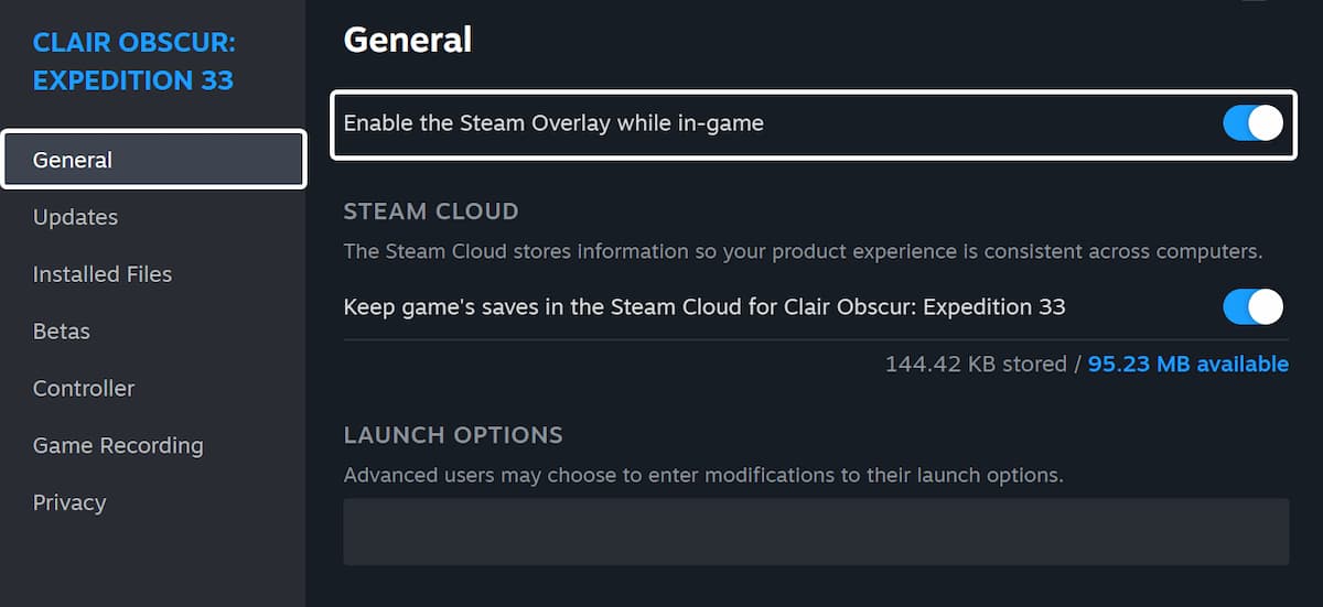 出于某种原因,如果您禁用了 Steam Overlay(我不知道为什么要这样做),那么《Clair Obscur: Expedition 33》会在启动几秒钟后崩溃。我不确定为什么会发生这种情况,但可能有一项检查需要启用 Steam 覆盖。以下是启用此功能的方法: