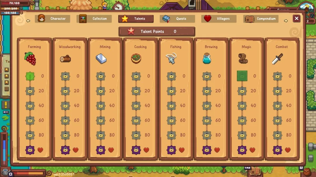 Pixelshire 擁有令人印象深刻的核心技能天賦樹系統:農業、木工、採礦、烹飪、釣魚、釀造、魔法和戰鬥。每棵樹都有多種好處,可以提高您的整體生活質量。他們甚至在遊戲的浪漫系統後面鎖定了一個秘密福利。