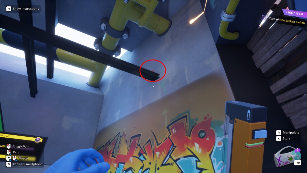 拿到控制桿後,將其舉起並與損壞的開關進行交互。它應該自動將其放在開關上。打開開關,它應該完成“點亮它”任務。它會炸毀大容器並為您的工作場所開闢更大的區域。